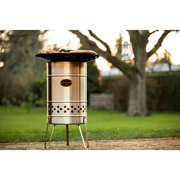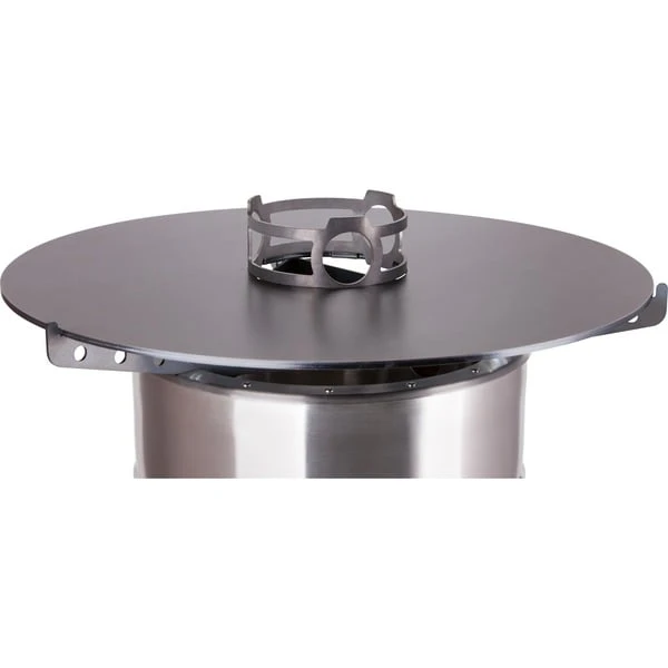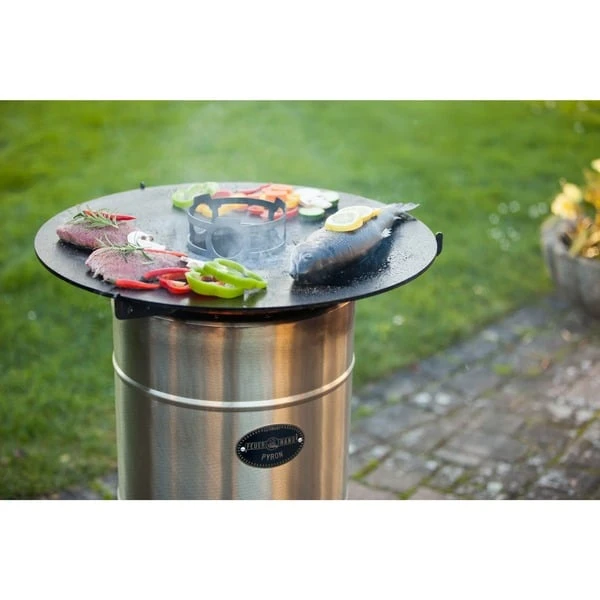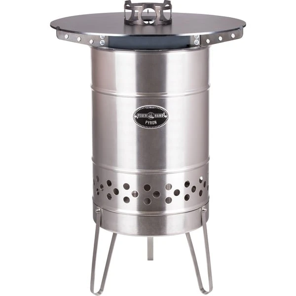 Die Feuerhand Pyron Plate verwandelt den Feuerhand Pyron in eine Kochstation und ermöglicht mehr als Grillen: Rundum Kochen auf dem Pyron. Auf der massiven 6mm starken Stahlplatte kann man mit der Hitze nach Herzenslust aromatisch braten. Die Platte wölbt sich leicht, so dass das Essen nicht an der Seite herunterfällt. Der Kochaufsatz in der Mitte sichert Eier, Würstchen und Co. gegen ein Abrutschen ins Feuer. Der Kochaufsatz in der Mitte der Platte dient als stabile Abstellmöglichkeit von Töpfen, Kesseln und Kannen. So kann man die Hitze des Pyron nutzen, um mit Freunden ganze Gänge auf der Pyron Plate zuzubereiten. Die großzügigen Aussparungen versorgen die Feuertonne auch mit Kochgeschirr auf dem Aufsatz mit genügend frischem Sauerstoff, um das Feuer ordentlich brennen zu lassen. Außerdem ermöglicht die Aussparung in der Mitte des Aufsatzes ein sicheres Nachfüllen von Holz während der Benutzung. Mit dem dreiarmigen Trägergestell liegt die Pyron Plate sicher auf dem Pyron auf.Art.-Nr.: 1532785