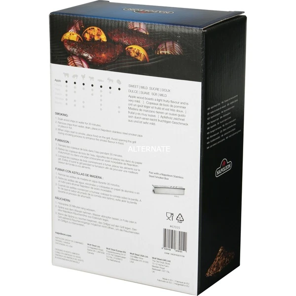 Die Napoleon Apfel-Räucherchips verleihen dem Grillgut ein süßliches Aroma. Das Holz des Apfelbaums ist mittelfest und in weiten Teilen der gemäßigten Klimazone zu finden. Apfelholz wird in der Küche vor allem aufgrund seines angenehmen Duftes und seines süßlichen Räucheraromas geschätzt. Speisen wie Meeresfrüchte, Fisch, besonders Lachs, und Schalentiere sind besonders zum Räuchern mit Apfelholz geeignet. Auch Schweinekotelett, Filets und Kalbfleisch profitiert von der süßlichen Note, ebenso wie Früchte und Gemüse. Für das optimale Aroma legt man die Räucherchips mindestens 30 Minuten vor der Verwendung in Wasser, Apfelsaft, Ale, Wein oder Most, Chardonnay, Pinot Noir oder Ananassaft ein. Dann nimmt man die Räucherchips aus der Flüssigkeit, füllt sie in die Napoleon Räucherpfeife und platziert diese über den Flammenschutzeinsätzen. Man kann die Räucherchips auch direkt in den integrierten Räuchereinsatz des Prestige PRO665RSIB füllen oder auf den glühenden Kohlen im Apollo Smoker AS300K oder AS200K platzieren. Wenn die Chips zu rauchen beginnen, legt man das Grillgut auf und schließt den Grilldeckel.Art.-Nr.: 1591757