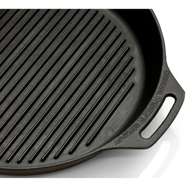 Die gusseiserne Petromax Grill-Feuerpfanne gp35 gehört mit ihrer exzellenten Wärmespeicherung zur Ausstattung jeder Küche. Sie ist für das Zubereiten von Fleisch, Gemüse und Co. mit dem besonderen Grillaroma ideal, da sich die Hitze in Gusseisen gleichmäßig verteilt und lange gespeichert wird. Die Rillen am Pfannenboden geben dem Bratgut nicht nur das typische Grillmuster, sondern ermöglichen auch besonders fettarmes und gesundes Braten. Ob in der Draußen-Küche über dem offenen Feuer gekocht wird oder auf dem Herd zuhause, man kann die Feuerpfanne sowohl auf herkömmlichen Herdplatten, auf Gasflammen, im Backofen als auch im Freien auf einer Kochstelle, über einem Lagerfeuer oder auf einem passenden Grill verwenden. Das Gusseisen mit seiner ausgezeichneten Wärmeverteilung und -speicherung ist dank der vorbehandelten Oberfläche (seasoned finish) sofort einsatzbereit und leicht zu pflegen.Art.-Nr.: 1532911